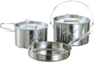 ステンレス製クッカー3点セット(18cm鍋、16cm鍋、20cmフライパン)。