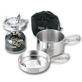 アウトドアでの料理に便利なクッカーと点火装置付きバーナーのセット。バーナーは小型ながらも3000kcalの高出力設計で、メインバーナーとしても十分な能力を備えている。
